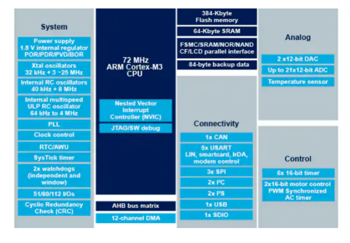 支持的外圍設備:定時器、ADC、DAC、SDIO、I2S、SPI、I2C和USART
