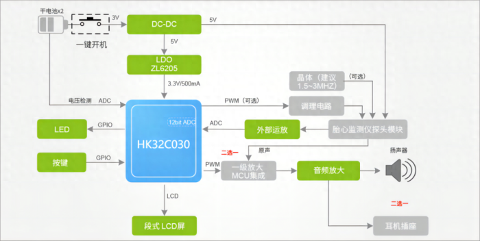 某品牌胎心儀采用航順芯片HK32C030系列MCU作為主控——胎心音由高靈敏度超聲探頭獲取后,配合快速檢測算法、降噪、運放放大后給到MCU內部采樣處理。HK32C030胎心儀方案具有高可靠性且支持高精度計算,能有效排除無效信號,可大幅提高胎心監測效率和準確性。