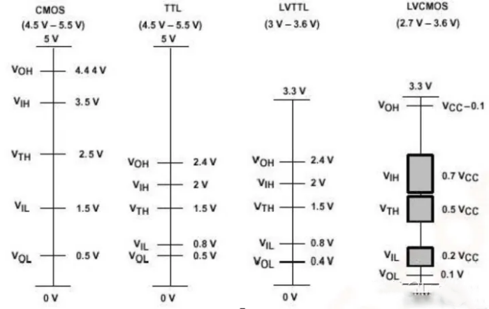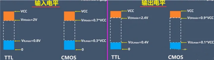 標準TTL:輸入高電平最小2V,輸出高電平最小2.4V,典型值3.4V,輸入低電平最大0.8V,輸出低電平最大0.4V,典型值0.2V。