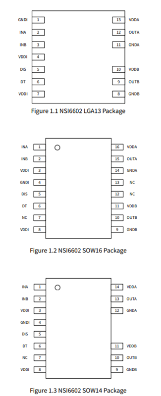 NSI6602是一系列高可靠性的隔離式雙通道柵極驅動器IC, 可以設計為驅動高達2MHz開關頻率的功率晶體管。每個輸出可以以快速的25ns傳播延遲和5ns的最大延遲匹配來提供最大4A/6A的拉灌電流能力。NSI6602在5*5mmLGA13封裝中按照UL1577提供2500Vrms隔離, 在SOP16封裝中提供3000Vrms隔離, 在SOW16和SOW14封裝中提供5700Vrms隔離。100kV/us的最小共模瞬變抗擾度(CMTI)提高系統魯棒性。該驅動器的最大電源電壓為28V,而輸入側則接受3V至5.5V的電源電壓。所有電源電壓引腳均支持欠壓鎖定(UVLO)保護。