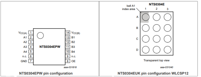 NTS0304E是帶自動(dòng)方向感應(yīng)的4位雙電源轉(zhuǎn)換收發(fā)器,支持雙向電壓電平轉(zhuǎn)換。該器件具有8個(gè)1位輸入輸出端口(A和B)、一個(gè)輸出使能輸入(OE)和兩個(gè)電源引腳(VCC(A)和VCC(B))。VCC(A)可以由介于0.95 V至3.6 V之間的任何電壓供電,VCC(B)可以由介于1.65 V至5.5 V之間的任何電壓供電,這使得此器件適用于任何電壓節(jié)點(diǎn)(0.95 V、1.2 V、1.8 V、2.5 V、3.3 V和5.0 V)之間的轉(zhuǎn)換。引腳A和OE引用至VCC(A),引腳B引用至VCC(B)。引腳OE處的低電平使輸出呈現(xiàn)高阻抗關(guān)斷狀態(tài)。