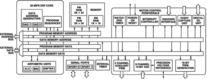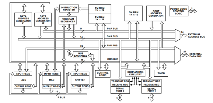 此外,ADMC401BST器件通過利用DSP內核的完整地址和數據總線,還增加了重要的外部存儲器和外設擴展能力。此功能允許擴展外部程序和數據存儲器,且意味著DSP內核可以尋址高達14K × 24位的外部程序存儲器和高達13K × 16位的外部數據存儲器。