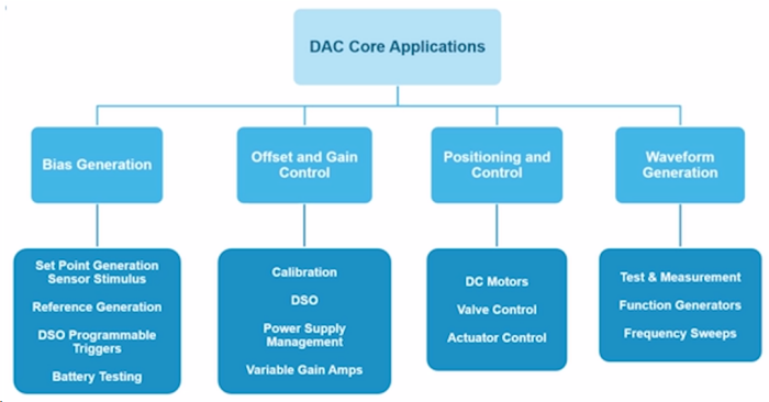 DAC在信號鏈中可以執行很多功能,例如偏置的生成、失調和增益控制、定位和控制,以及像波形的產生等。下圖顯示了一些主要的高端最終應用,在這些應用中經常可以找到特定功能的DAC。