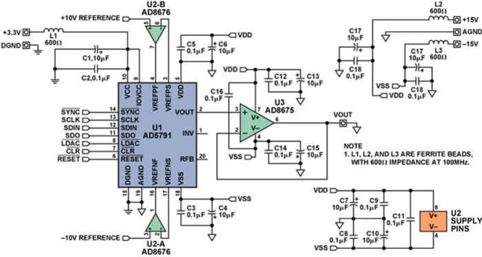 下圖是采用AD5791數模轉換器的一種精密電壓源電路示意圖,其中以AD5791 (U1)作為精密數控1 ppm電壓源,電壓范圍為±10V,增量為20 μV;以AD8676 (U2)作為基準緩沖;以AD8675 (U3)作為輸出緩沖,絕對精度取決于外置10 V基準電壓源的選擇。