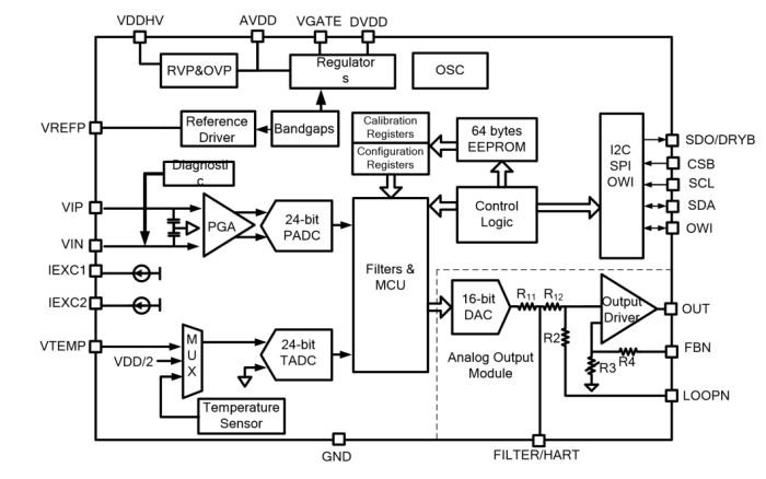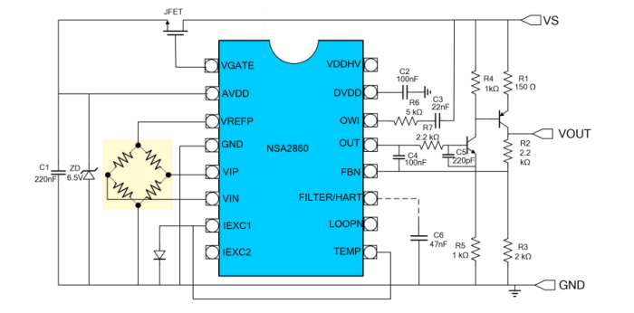 納芯微NSA2860是一顆高集成度的用于阻式或者電壓 型傳感器例如阻式壓力傳感器,熱電偶,RTD 等傳感器信號(hào)調(diào)理和變送輸出的專(zhuān)用芯片。 NSA2860集成了外部JFET控制器,24位主信號(hào) 測(cè)量通道和24位輔助溫度測(cè)量通道,傳感器校 準(zhǔn)邏輯,雙路恒流源等電路,并可以支持?jǐn)?shù)字 接口輸出,模擬電壓輸出,4~20mA變送輸出,PWM/PDM輸出等各種輸出模式。高集成 度和巧妙的接口方案,使得NSA2860僅需最少 的外部器件,即可實(shí)現(xiàn)壓力或溫度變送模塊的 校準(zhǔn)和變送。通過(guò)內(nèi)置的MCU,NSA2860支持 對(duì)傳感器的零點(diǎn),靈敏度的二階溫度漂移校準(zhǔn) 以及最高三階的非線性校準(zhǔn),校準(zhǔn)精度可以達(dá) 到0.1%以內(nèi),其校準(zhǔn)系數(shù)存儲(chǔ)于一組EEPROM 中。