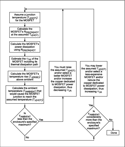 圖1. 該流程圖展示了選擇各MOSFET (同步整流器和開關MOSFET)的迭代過程。在這個過程中,各MOSFET的結溫為假設值,兩個MOSFET的功率耗散和允許環境溫度通過計算得出。當允許的環境溫度達到或略高于我們所期望的機箱內最高溫度時(機箱內安裝了電源及其所驅動的電路),這個過程就結束了。