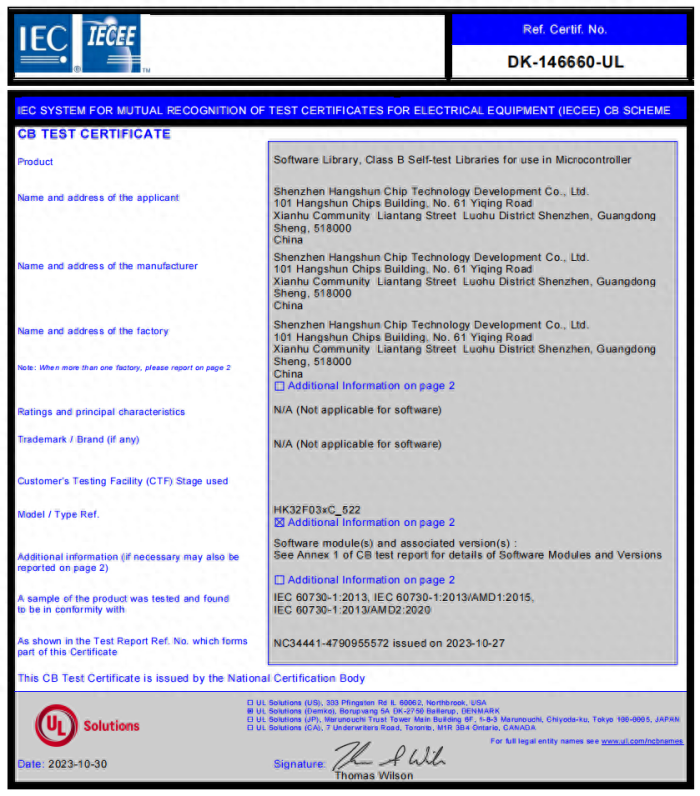 UL Solution為航順簽發(fā)IEC 60730認(rèn)證證書