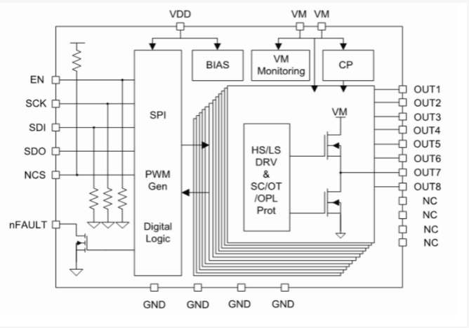 NSD8308-Q1HTSXR是一款多通道半橋驅(qū)動芯片,內(nèi)部集成8通道半橋,通過靈活配置,芯片可以支持多種不同的負(fù)載類型包括直流有刷電機,步進(jìn)電機,繼電器和LED等。該芯片內(nèi)置PWM生成器,僅通過SPI即可實現(xiàn)配置PWM頻率與占空比以達(dá)到控制負(fù)載的功能,可應(yīng)用于直流有刷電機軟啟動與LED調(diào)光等;同時該產(chǎn)品提供智能診斷功能,幫助車機系統(tǒng)判斷負(fù)載連接狀態(tài),如果出現(xiàn)斷線或者短路情況,外部MCU可以通過芯片內(nèi)部寄存器獲取獨立通道的報錯信息。