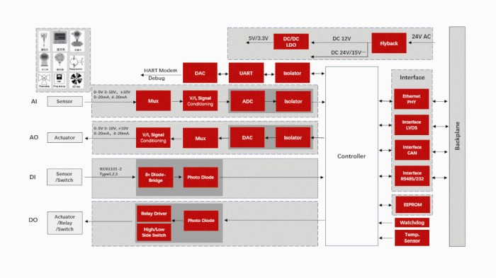 從PLC框圖可以看出,它包含控制器和存儲模塊、模擬量、數字量輸入輸出模塊、通信模塊、供電模塊等。