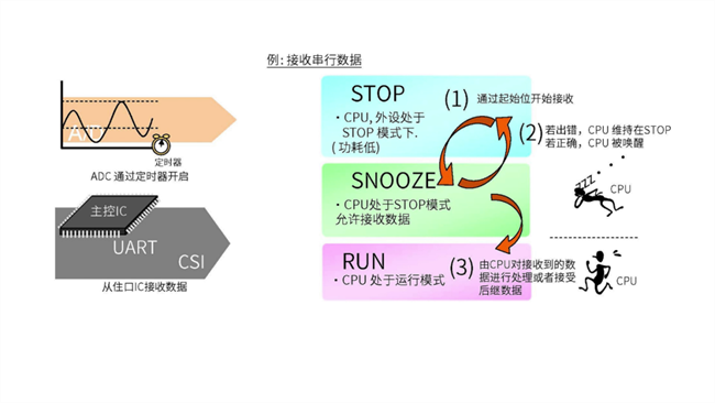 芯片還提供了多種低功耗模式,支持RTC和DMA的HALT模式、支持串口和ADC的SNOOZE模式以及SRAM保持的STOP模式,可以根據不同的低功耗場景進行選擇。