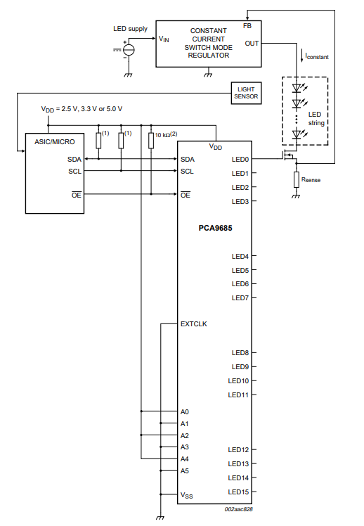 如果是PCA9685,則LEDn輸出引腳的上電復(fù)位(POR)默認(rèn)狀態(tài)為低電平。對(duì)于PCA9635則為高電平