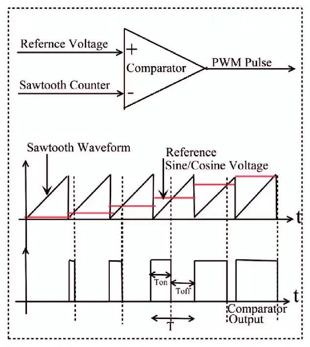 它的工作原理是在開(kāi)關(guān)頻率不變的情況下(開(kāi)關(guān)周期不變),通過(guò)去改變脈沖寬度,從而達(dá)到調(diào)制輸出電壓的效果。