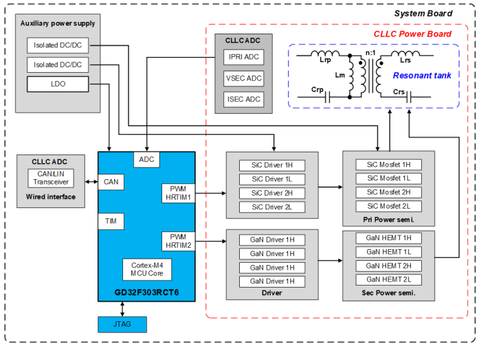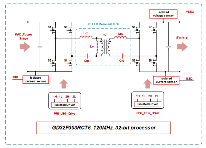 采用GD32F303RCT6微控制器:得益于HRPWM定時與ADC采樣的高精度,使得CLLC將設計頻率提高到500kHz在數字控制的可實現性上,變成了可能,從而為整機系統的高功率密度和高效率綜合優化提供了控制保障