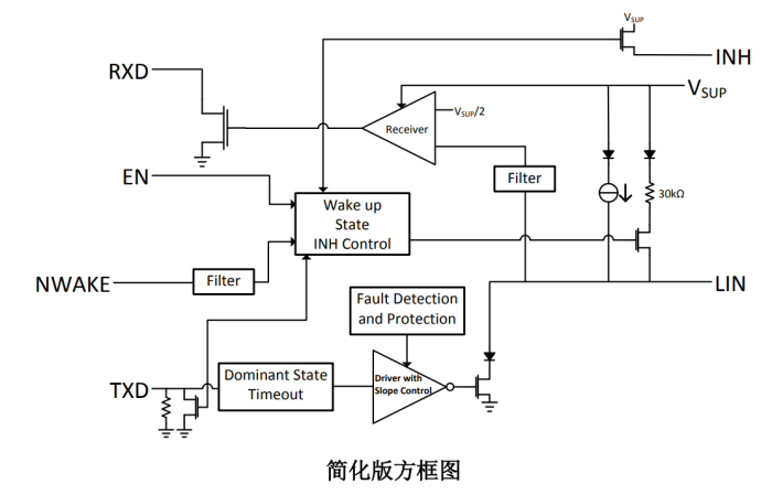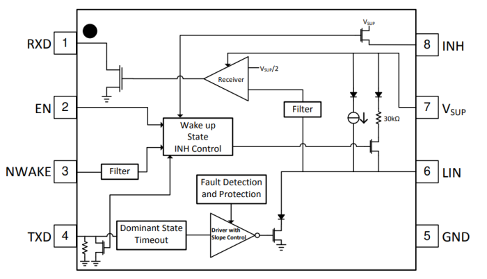 睡眠模式:超低電流消耗,支持來自 LIN 總線、喚醒輸入(外部開關)或主機微控制器的喚醒事件