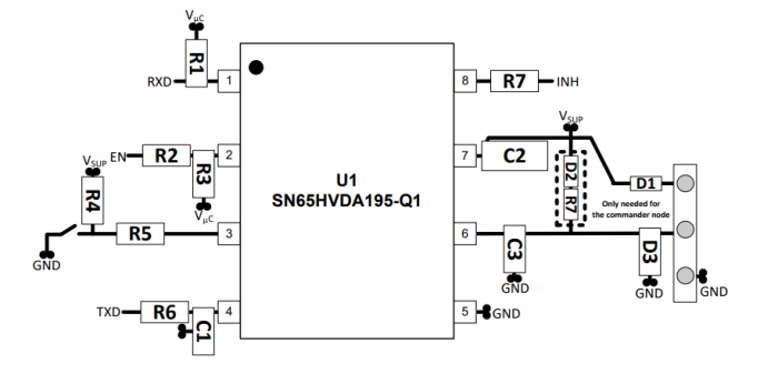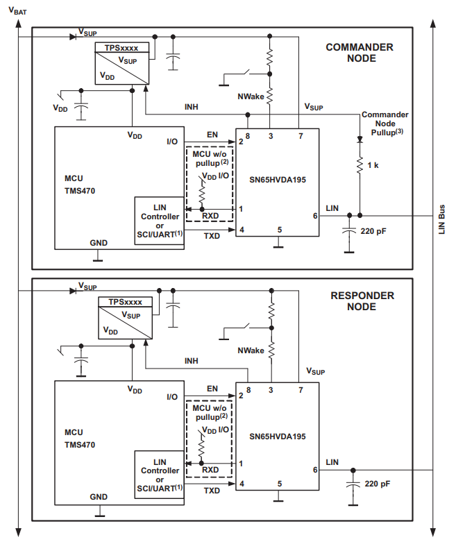 SN65HVDA195 器件是本地互連網絡 (LIN) 物理接口和 MOST ECL 接口,該接口集成了具有喚醒和保護功能的串行收發器。該總線是一種單線雙向總線,通常用于數據速率達 20kbps 的低速車載網絡。該器件能以 0kbps 的有效數據速率進行傳輸,因為它沒有顯性狀態超時。SN65HVDA195 通過限流波形整形驅動器將 TXD 上的協議輸出數據流轉換為總線信號,如 LIN 物理層規范修訂版 2.0 所述。接收器對來自總線上的數據流進行轉換并通過 RXD 將此數據流輸出。總線共有兩種狀態:顯性狀態(電壓接近接地)和隱性狀態(電壓接近電池)。在隱性狀態下,總線被 SN65HVDA195 內部上拉電阻器和串聯二極管拉高,因此響應者模式應用無需外部上拉元件。按照 LIN 規范,指揮官應用需要一個外部上拉電阻器 (1k?) 加上一個串聯二極管。