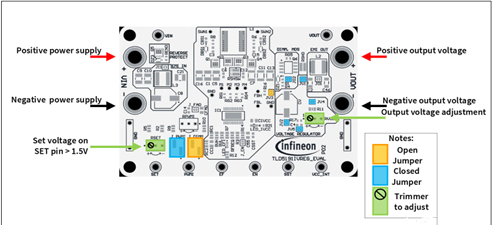 下面我們再來看這塊采用TLD5191ES的評估板卡TLD5191IVREG-EVAL。這塊板卡將TLD5191ES芯片的一些關鍵引腳做了引出,便于我們去觀察這些關鍵點在工作時輸出的信號,分別是SET、PWMI、EF、EN、SST、VCC_INT以及VIN、VOUT,通過板卡的原理圖我們就可以確定這些測點分別連接在TLD5191ES芯片和板卡的哪個位置。板卡共有3個可調電阻,RSET用來設置輸出電流,RPWMI用來調節PWM調光時的輸出占空比,RVOLT用來調節板卡工作在可調電壓輸出模式的輸出電壓。板載2個LED指示燈,一個藍色的用來表示TLD5191ES芯片的通電狀態,一個紅色LED用來顯示TLD5191ES的故障狀態。然后就是電源輸入與功率輸出端子,都采用了4mm的香蕉座,如果手里正好有4mm香蕉插頭,在使用和測試這塊板卡時就非常方便了。