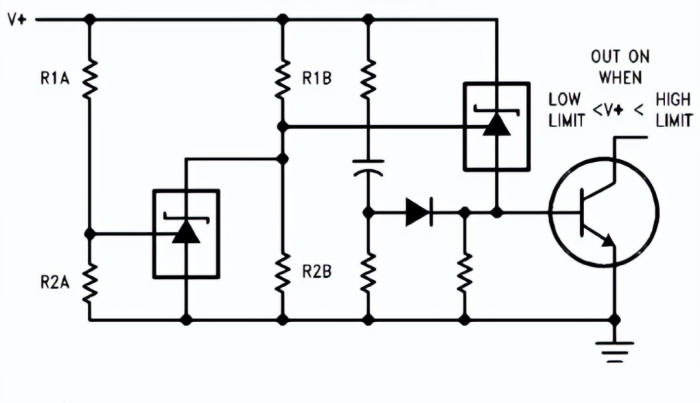 分析電路可以知道,輸出電壓高于 high limit 時,左邊 LM431 的輸出三級管導通,導致右邊的 LM431 輸出三極管截止,導致最右邊的三極管截止,沒有輸出。