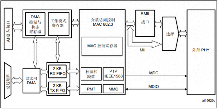 ·通過符合IEEE802.3的MII/RMII接口與外部以太網PHY進行通信;