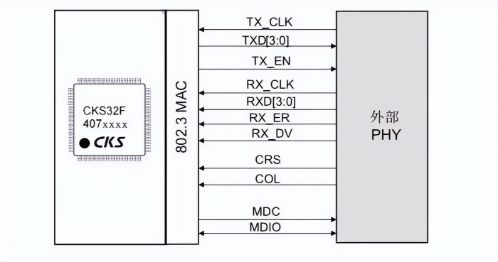 MII接口,即介質獨立接口,用于MAC層與PHY層進行數據傳輸。CKS32F4xx系列通過MII與PHY層芯片的連接如圖2所示: