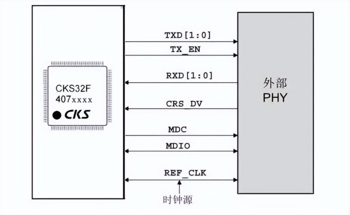 從上圖可以看出RMII相比MII,引腳數量精簡了不少。注意,圖中的REF_CLK信號,是RMII和外部PHY共用的50Mhz參考時鐘,必須由外部提供,比如有源晶振,或者CKS32F4xx系列的MCO輸出。不過有些PHY芯片可以自己產生50Mhz參考時鐘,同時提供給CKS32F4xx系列,這樣也是可以的。