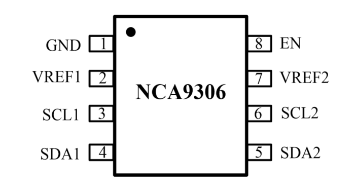 NCA9306-DVSR器件是一款采用使能(EN)輸入的雙路雙向I2C和SMBus電壓電平轉換器,可以在1.2V到5V之間實現雙向電壓轉換而無須使用方向引腳。此開關具有低導通狀態電阻(RON),可以在最短傳播延遲情況下建立連接。當EN為高電平時,轉換器開關打開,并且SCL1和SDA1 I/O被分別連接至SCL2和SDA2 I/O,從而實現端口間的雙向數據流。當EN為低電平時,轉換器開關關閉,在端口之間存在一個高阻抗狀態。除了電壓轉換,NCA9306-DVSR器件還可用于將400kHz總線與100kHz總線隔離開,方法是在快速模式通信過程中控制EN引腳以斷開較慢總線的連接。