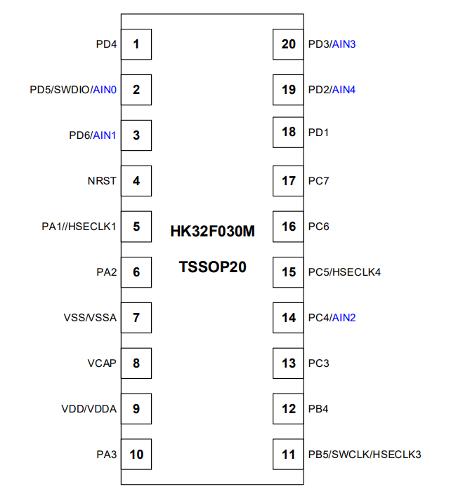 HK32F030MF4P6除電源、地以外的所有引腳都可以作為 GPIO、外設 IO 或外部中斷輸入 (TSSOP20 封裝產品支持 16 個 GPIO);在引腳數量受限應用場景中最大可能的提供引腳 信號數量。