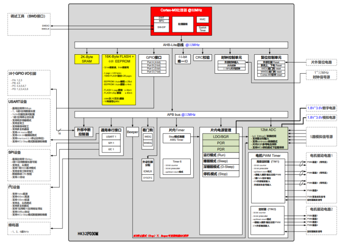 HK32F030MF4P6內置 1 個 16-bit 高級 PWM 定時器(共 4 路 PWM 輸出,其中 3 路帶死區 互補輸出),1 個 16-bit 通用 PWM 定時器(共 4 路 PWM 輸出);1 個 16-bit 基本定時器(定 時輸出 CPU 中斷)。 HK32F030M 內置了模擬電路:1 個 12-bit 1Msps ADC(有效精度 8Bit)、1 個 POR/PDR 上/下電復位電路和 1 個內部參考電壓(內部參考電壓在片內被 ADC 采樣)。 HK32F030M 支持豐富的功耗模式,在低功耗模式下,HK32F030M 可被內部的低功耗 定時器自動喚醒。 HK32F030MF4P6工作于-40°C 至+85°C 的溫度范圍,供電電壓 1.8V 至 3.6V,可滿足絕大 部分應用環境條件的要求。