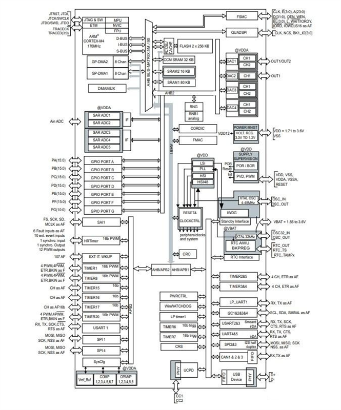 STM32G474QET6嵌入了高速存儲器(512KB的閃存和128KB的SRAM)、用于靜態存儲器的靈活外部存儲器控制器(FSMC)(適用于100引腳及以上封裝的設備)、Quad SPI閃存接口以及連接到兩條APB總線、兩條AHB總線和32位多AHB總線矩陣的大量增強型I/O和外圍設備。