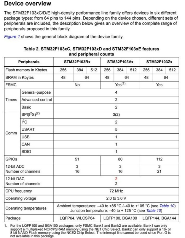 這頁顯示的是三類芯片的參數,如果想獲取STM32F103ZE芯片的參數,還需要繼續閱讀手冊。