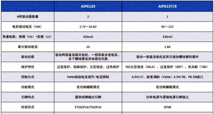 中微愛芯推出了雙通道H橋電機驅動器芯片AiP6133和單通道H橋電機驅動電路AiP6137/6138,每個H橋的輸出驅動器由N溝道功率MOSFET組成,用于驅動直流電機和其他感性負載,廣泛應用于運動控制類系統。