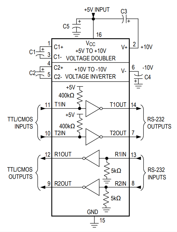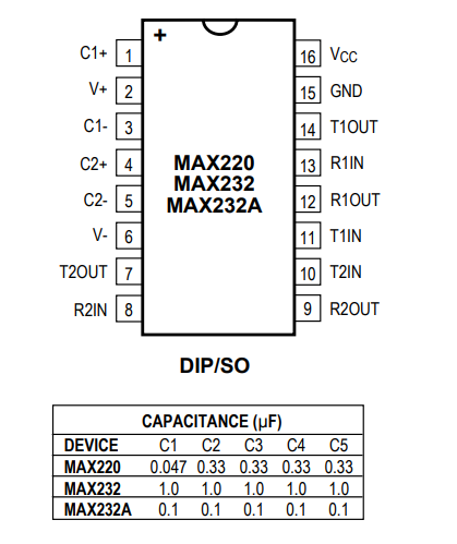 MAX232CSE封裝為SOP16,可操作溫度范圍從0至+70°C。