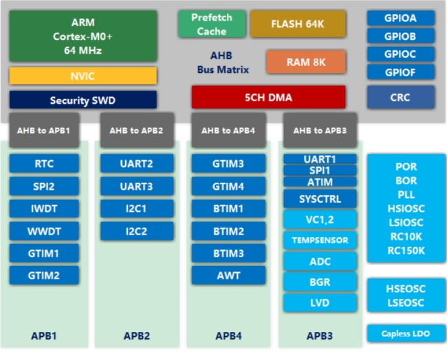 CW32A030C8T7是基于ARM? Cortex?-M0+內(nèi)核,采用Prefetch+Cache架構(gòu),以64MHz為量產(chǎn)測(cè)試保證,芯片配置64K字節(jié)FLASH,8K 字節(jié)RAM,128字節(jié)OTP存儲(chǔ)器。芯片采用1.65 5.5V寬電壓供電,工作溫度范圍-40+105℃。