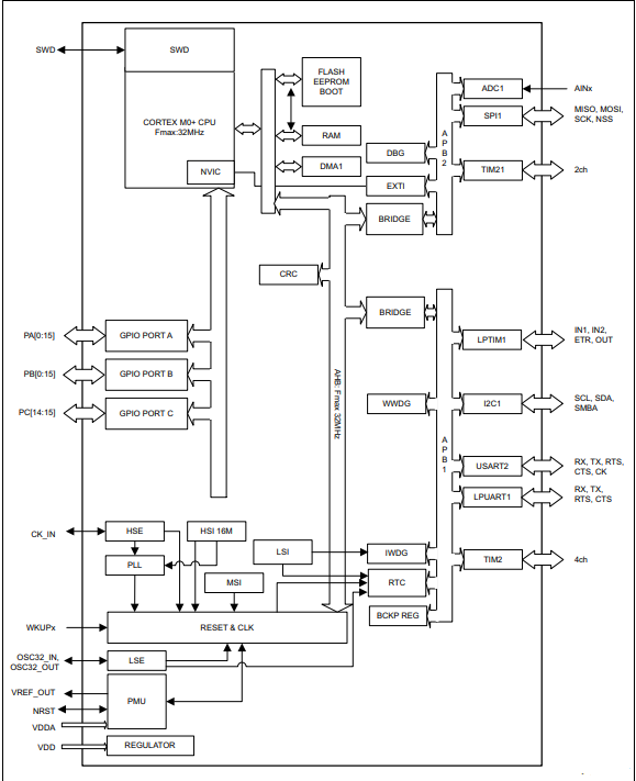 STM32L010F4P6在廣泛的性能范圍內提供高功率效率。這是通過大量選擇內部和外部時鐘源、內部電壓自適應和幾種低功率模式來實現的。