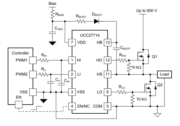 UCC27714DR器件可接受的偏置電源輸入范圍寬達10V至20V,并且為VCC和HB偏置電源引腳提供了UVLO保護。UCC27714DR采用SOlC-14封裝,額定工作溫度范圍為- 40°C至125°C。