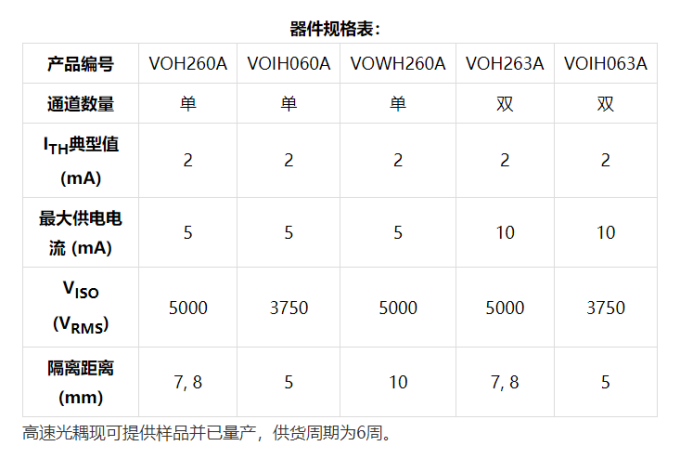 器件符合RoHS標準,最大額定耐受隔離電壓5000 VRMS,5 mm至10 mm隔離距離滿足廣泛要求,包括工作電壓超過1000 V的應用需求。