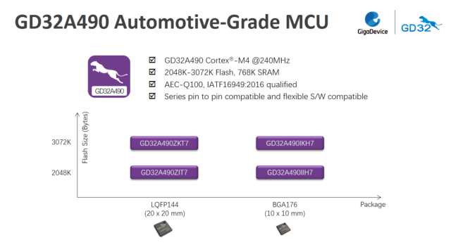 ▲GD32A490系列Cortex?-M4內核車規級MCU GD32A490系列車規級MCU采用Arm? Cortex?-M4內核,運行主頻高達240MHz,配備了高達3072KB片上Flash,以及768KB SRAM。支持代碼執行零等待,性能可達355 DMIPS。還集成了豐富外設資源,提供多達4個USART和4個UART,3個I2C,6個SPI,2個I2S,其中USART支持與LIN通信互傳。 為滿足車載網關的應用所需,還支持2個CAN2.0B、100M以太網及USB2.0 FS/HS通信。片上集成了TFT LCD控制器及各種多媒體接口,適合車載中控、娛樂影音、儀表盤等多元化場景。 GD32A490配備了3個采樣速率高達2.6M SPS的12位高速ADC和2個12位DAC以支持車用電機控制,多達140個GPIO可以實現BCM模塊多負載控制。該系列MCU提供了BGA176和LQFP144兩種封裝、四個型號選擇,目前已經正式量產供貨。 ▲GD32A490系列車規MCU產品組合 GD32A490的推出進一步擴大了GD32A系列車規MCU的產品陣容。得益于GD32家族豐富完善的生態系統,用戶沿用已有的GD32調試量產工具、技術文檔、軟硬件平臺即可開發車規級項目,配套的GD32A490I-EVAL全功能評估板以及GD32A490Z-START入門級學習套件同步上市。 兆易創新的產品開發和管理體系已通過ISO 26262:2018汽車功能安全最高等級ASIL D流程認證,持續以高品質和高安全性的車規產品與服務,提升國產汽車在全球的競爭力。關于GD32 MCU 兆易創新GD32 MCU是中國高性能通用微控制器領域的領跑者,中國最大的Arm? MCU家族,中國第一個推出的Arm? Cortex?-M3、Cortex?-M4、Cortex?-M23、Cortex?-M33及Cortex?-M7內核通用MCU產品系列,并在全球首家推出RISC-V內核通用32位MCU產品系列,已經發展成為32位通用MCU市場的核心之選。以累計超過15億顆的出貨數量,超過2萬家客戶數量,45個系列550余款產品選擇所提供的廣闊應用覆蓋率穩居中國本土首位。 兆易創新GD32 MCU也是Arm?大學計劃(University Program, AUP)中國首批合作伙伴、Arm? mbed? IoT平臺生態合作伙伴、RISC-V基金會戰略會員、“兆易創新杯”中國研究生電子設計競賽的冠名廠商。GD32以打造“MCU百貨商店”規劃發展藍圖,為用戶提供最全面的系統級產品和解決方案支撐,構建智能化開發平臺和完善的產品應用生態。更多信息歡迎訪問GD32MCU.com。 關于兆易創新 兆易創新科技集團股份有限公司(股票代碼603986)是全球領先的Fabless芯片供應商,公司成立于2005年4月,總部設于中國北京,在全球多個國家和地區設有分支機構,營銷網絡遍布全球,提供優質便捷的本地化支持服務。兆易創新致力于構建以存儲器、微控制器、傳感器、模擬產品為核心驅動力的完整生態,為工業、汽車、計算、消費電子、物聯網、移動應用以及通信領域的客戶提供完善的產品技術和服務,已通過ISO26262:2018汽車功能安全最高等級ASIL D體系認證,并獲得ISO 9001、ISO 14001、ISO 45001等體系認證和鄧白氏認證,與多家世界知名晶圓廠、封裝測試廠建立戰略合作伙伴關系,共同推進半導體領域的技術創新。
