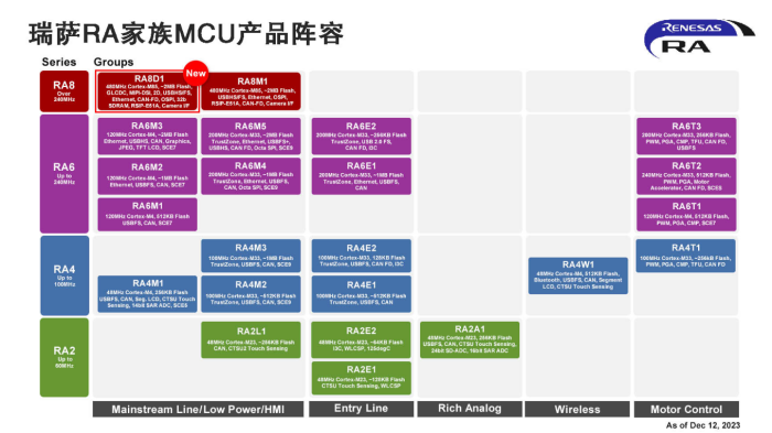 2023 年 12 月 12 日,中國北京訊 - 全球半導體解決方案供應商瑞薩電子今日宣布推出RA8D1微控制器(MCU)產品群。RA8D1產品群作為瑞薩RA8系列的第二款產品,RA8是基于Arm? Cortex?-M85處理器的首款MCU。RA8D1 MCU具有超過6.39 CoreMark/MHz(注)的突破性性能,結合充足的內存和經過優化圖形與外設功能,可滿足樓宇自動化、家用電器、智能家居、消費及醫療等廣泛應用的各類圖形顯示和語音/視覺多模態AI要求。