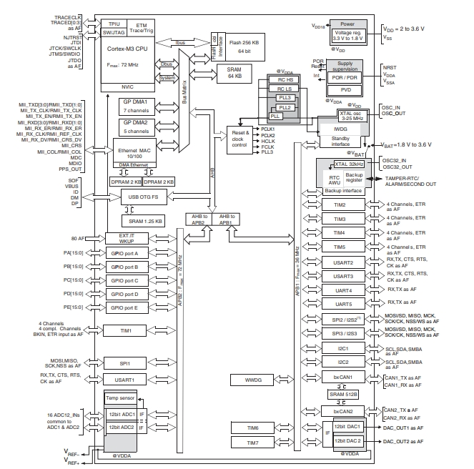 STM32F105VCT7提供兩個12位ADC、四個通用16位定時器和一個PWM定時器,以及標準和高級通信接口:最多兩個I2C、三個SPI、兩個I2、五個USART、一個USB OTG FS和兩個CAN。以太網僅在STM32F107xx上可用。