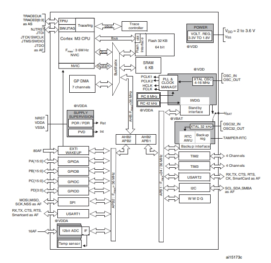 STM32F101T6U6A提供標準通信接口(一個I2C,一個SPI和兩個usart),一個12位ADC和最多兩個通用16位計時器。STM32F101T6U6A低密度接入線系列工作在-40到+85°C的溫度范圍內,從2.0到3.6 V電源。一套全面的省電模式允許設計低功耗應用程序。