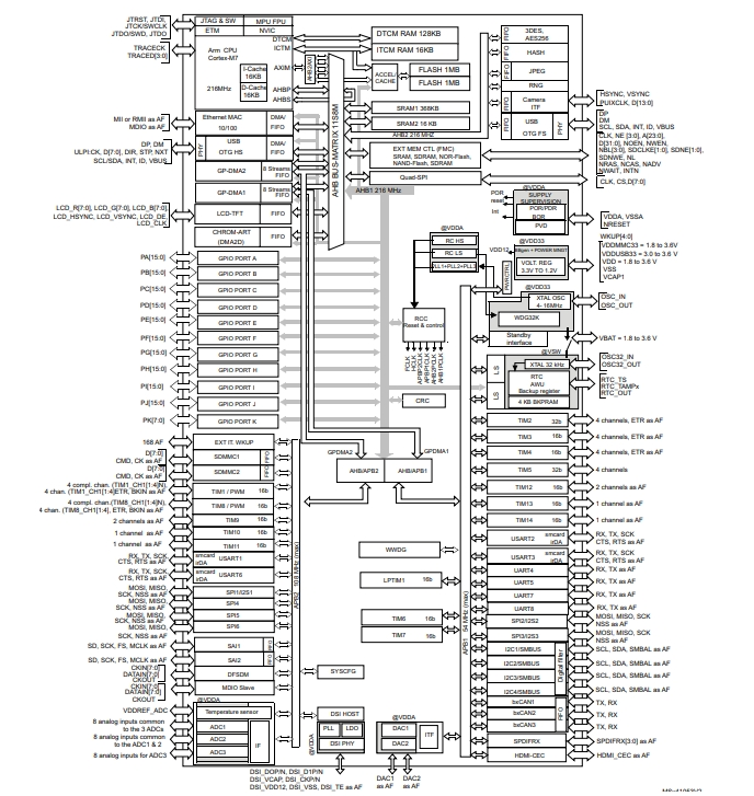 STM32F777BIT6包含高速嵌入式存儲(chǔ)器,閃存容量高達(dá)2M字節(jié)、512 KB SRAM(包括用于關(guān)鍵實(shí)時(shí)數(shù)據(jù)的128 KB數(shù)據(jù)TCM RAM)、16 KB指令TCM RAM(用于關(guān)鍵實(shí)時(shí)例程)、4 KB備份SRAM,以及連接到兩條APB總線、兩條AHB總線、32位多AHB總線矩陣和支持內(nèi)部和外部存儲(chǔ)器訪問的多層AXI互連的大量增強(qiáng)型I/O和外圍設(shè)備。