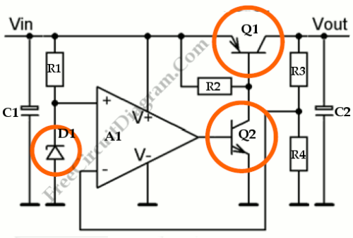 如果穩壓器需要調節低壓源,則 Q2 必須具有低壓降 Vce,但如果輸入電源電壓較高,則Q2 的 Vce 壓降并不那么重要。