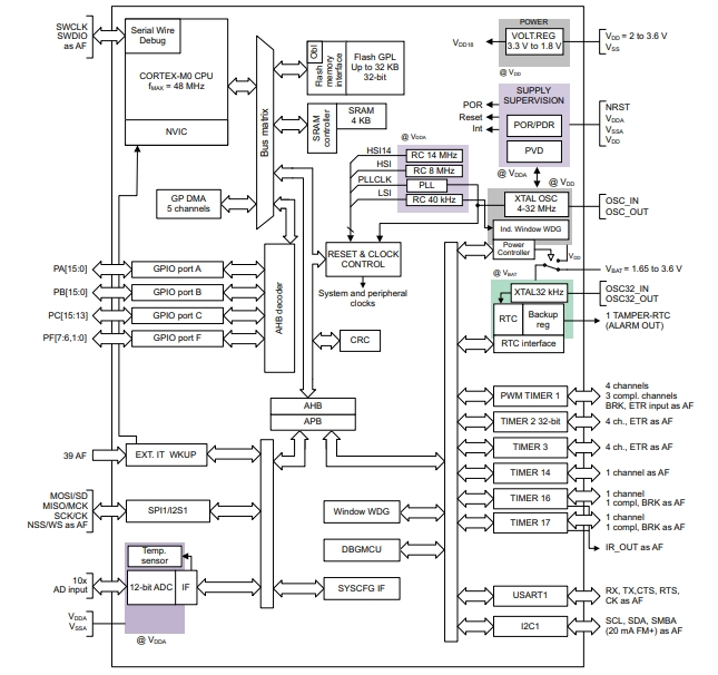 STM32F031C6T7提供標準通信接口(一個i2c,一個SPI/I2S和一個USART),一個12位ADC,五個16位定時器,一個32位定時器和一個高級控制PWM定時器。STM32F031C6T7微控制器工作在-40到+85°C和-40到+105°C的溫度范圍內,從2.0到3.6V電源。一套全面的省電模式允許設計低功耗應用程序。
