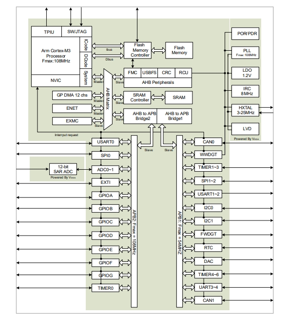 GD32F107VET6 MCU采用32位ARM? Cortex?-M3內核,運行頻率最高可達108MHz,Flash存取達到零等待狀態,可實現最高效率,同時還提供高達3024KB的片上閃存和高達96KB的SRAM,支持連接到兩條APB總線的增強型I/O口和各種片內外設。此系列MCU提供高達3個12-bit 1MSPS ADC和10個通用型16-bit定時器,1個PWM高級定時器,以及配備標準型和高級通信接口。