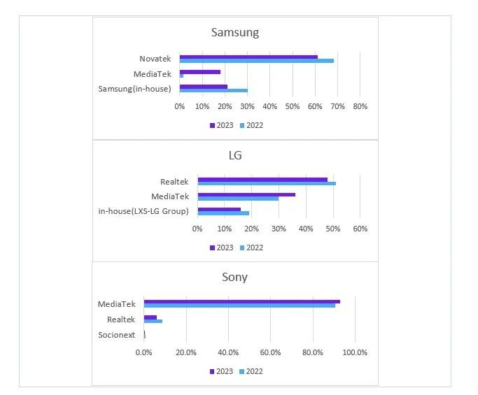 Samsung電視品牌于2022年可見其TV SoC的分配狀況(圖二),Mediatek自2022年9月開始出貨,2022年占有約2%的比率,目前預(yù)計(jì)2023年將提升至18%,可預(yù)期Novatek及Samsung (in-house) 將減少在Samsung的TV出貨占有率。