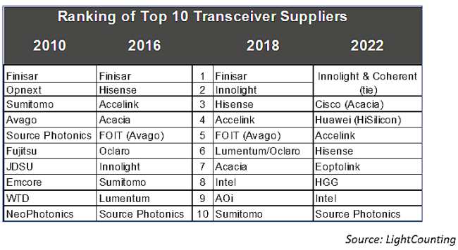 2022年,旭創科技(排名并列第1)、華為(排名第4)、光迅科技(排名第5)、海信寬帶(排名第6)、新易盛(排名第7)、華工正源(排名第8)、索爾思光電(排名第10)入圍。值得一提的是,索爾思光電被中國公司收購,故本期已是中國光模塊廠商。