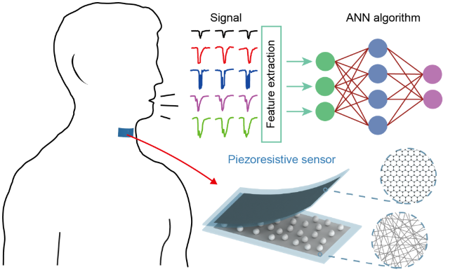 具有無聲語音識別能力的貼片式智能傳感器(貼片式人工電子喉)將促進患者之間交流的便利性。智能人工喉通過將深度學習算法與高靈敏的壓阻式傳感器相結合,可以成功識別出說不同單詞時喉嚨的細微振動。雖然一些現有技術已經使用貼片式傳感器進行聲音檢測,但這些設備只是檢測到喉嚨的運動,而沒有進一步探索將人工智能用于語音識別的可行。研究者表示,開發的設備能夠檢測說話過程中的喉嚨振動,并將電信號轉化為可讀的文字,這進一步證明它可以成為促進患者交流的有價值的工具。