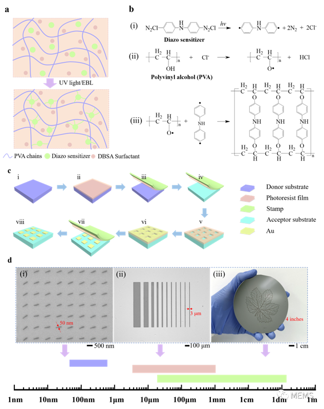 硅基光刻技術具有高分辨率、高精度、易于集成和高通量等優點,已成為制造微電子器件的主要工藝之一。然而,硅基光刻技術在柔性電子器件制造中的應用受到材料兼容性等問題的限制,因此需要新的制造工藝來滿足柔性電子器件的制造需求。該團隊開發出一種 “光刻膠全干法轉印”新型光刻工藝,該工藝的關鍵在于開發了一種環保型(水基)可轉印光刻膠材料,光刻膠具有對紫外光(UV)和電子束(EBL)輻照的雙重敏感性,可用于制造多尺度圖案。通過精準調控光刻膠材料表面能及轉移參數,從而實現高分辨、高密度、跨尺度光刻膠結構在硅基襯底上的脫附,并將其無損轉移到柔性聚合物或不規則襯底上。利用光刻膠結構作為掩膜圖案,結合金屬沉積工藝和Lift-off工藝,可以實現柔性、不規則襯底上電子元器件的原位和保形制造。這種工藝具有高效、環保、低成本等特點,有望滿足現代柔性電子器件對高精度、高可靠性和高穩定性的要求。