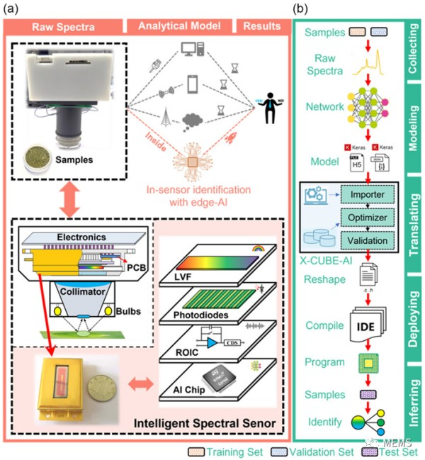 基于近紅外光譜的AI分析模型的片上集成是智能光譜傳感器發展的關鍵環節,具體流程如圖1b所示。