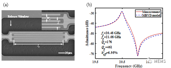A3超高頻高耦合聲波諧振器 (a)諧振器SEM圖像,(b)諧振器測試導(dǎo)納曲線