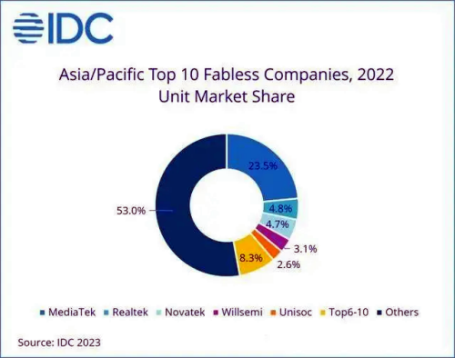 亞太地區排名前十的IC設計廠商包括中國臺灣的聯發科、瑞昱、聯詠和奇景科技;中國大陸的韋爾股份、紫光展銳、華為海思、兆易創新和比特大陸;以及韓國的LX Semicon。聯發科在前十大IC設計公司中占有近50%的市場份額,發揮著重要作用。聯發科的增長發揮了主導作用,幫助彌補了其他中國臺灣IC設計公司的不足,導致中國臺灣在亞太地區的IC設計市場份額比2021年整體增加了2%。